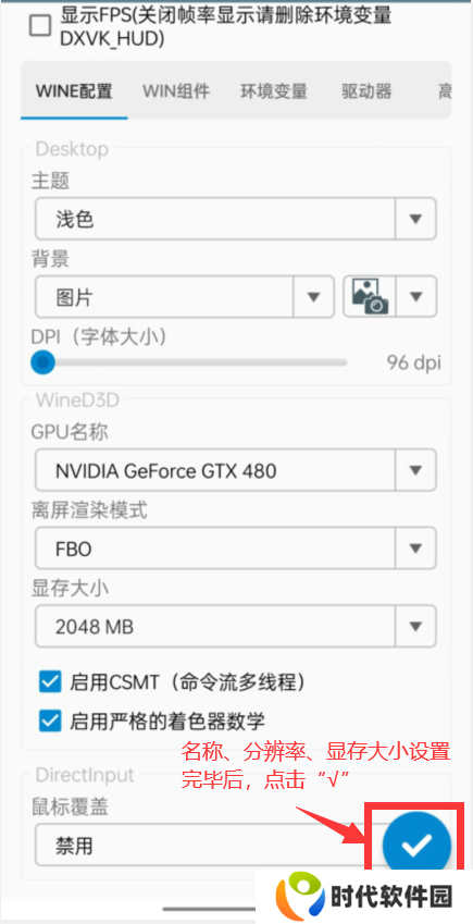 7、名称、屏幕分辨率、显存设置完毕后点击“√”;