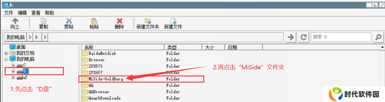 9、先点击D盘,再点击“MiSide-GoldBerg”文件夹(滑动屏幕使鼠标移动到相应的位置后双击屏幕);